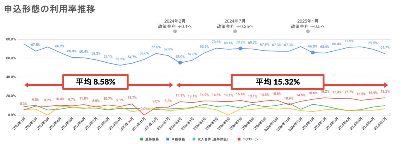 - 連帯債務や収入合算といった他の協働型ローンも利用率を伸ばしており、金利変動が消費者のリスク回避志向を高めた可能性が読み取れます。