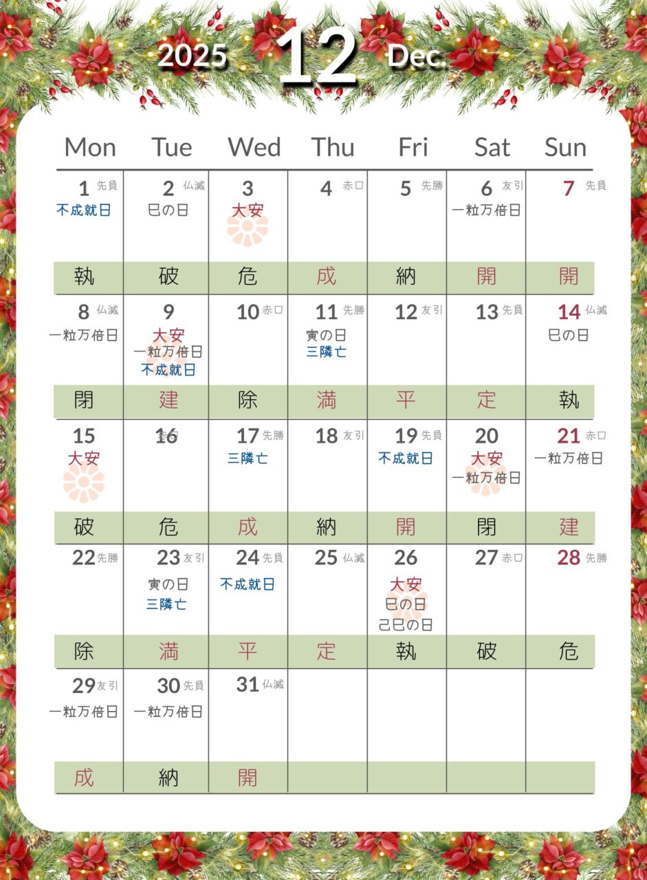 2025年12月の“縁起のいい日”、ダブルで重なる良い日はありませんでした。