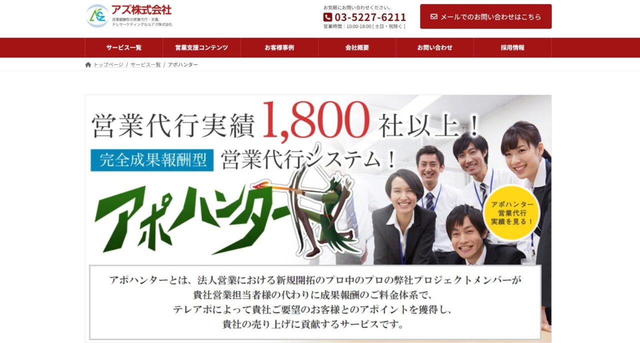アズ株式会社のアポハンターはテレアポによってアポイントを獲得する、完全成果報酬型の営業代行システムです。営業代行実績は1,800社以上と、数々の実績を誇ります。