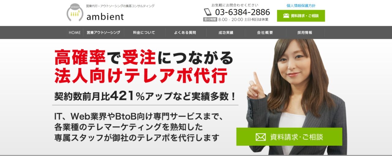 株式会社ambientのテレアポ代行は高確率で受注につながる、法人向けテレアポ代行会社です。契約前月比421%アップなど、多数の実績を揃えています。