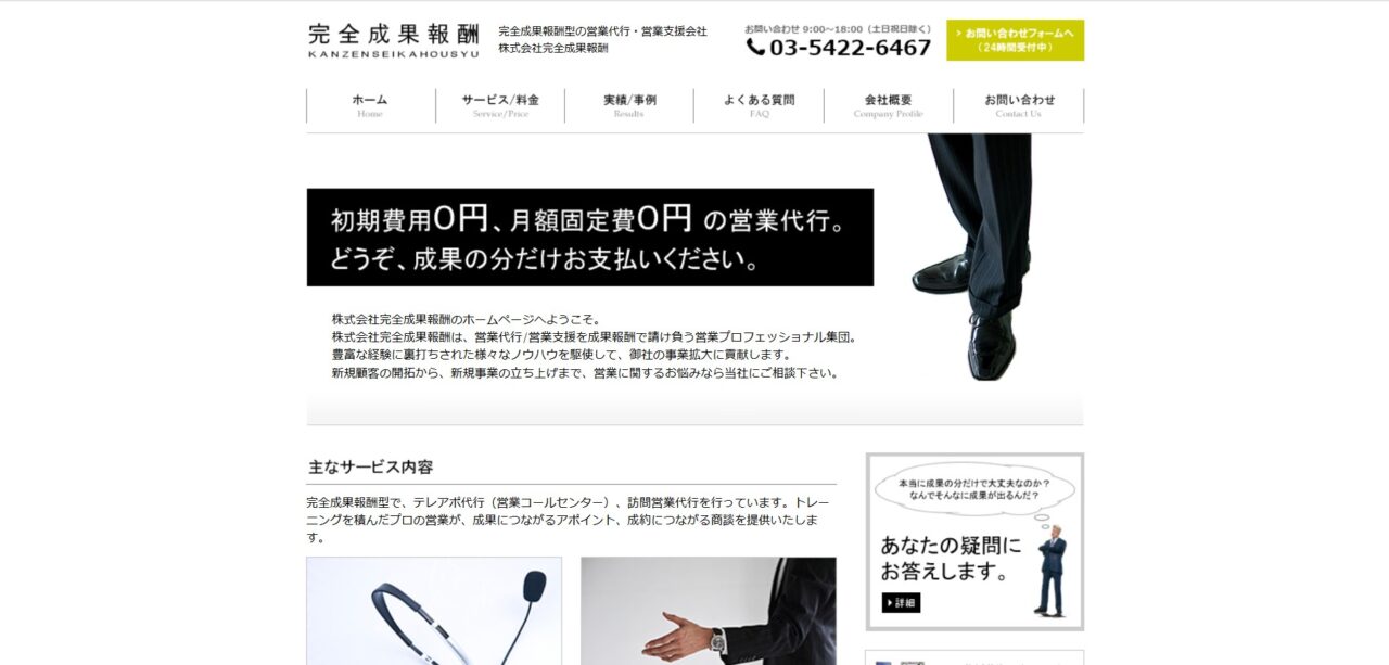 完全成果報酬は社名のとおり、アポイントの取れた分に関してのみ費用がかかる「完全成果型」のプランを提供するテレアポ代行会社です。